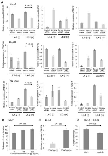 REG3A enhanced HCC proliferation by reciprocally influencing PDGF-ββ. (A) REG3A siRNA significantly decreased the mRNA expression of PDGF-ββ in cocultured HCC cells (p < 0.05). The experiment was repeated three times. The data are expressed as mean ± SD. (B) Exogenous PDGF-ββ (200 ng/mL) enhanced the proliferation of HCC cells based on the MTT assay results (p < 0.05). The experiment was repeated three times. The data are expressed as mean ± SD. (C) Exogenous PDGF-ββ enhanced the expression of REG3A in cocultured HCC cells. The experiment was repeated three times. The data are expressed as mean ± SD. (D) Huh-7 cells were treated with PDGF receptor inhibitor (imatinib, 10 μM) under coculturing with LX-2. After 24 h, an MTT assay revealed that imatinib significantly suppressed the proliferation of Huh-7 cells (p < 0.05). Data are expressed as mean ± SD of percent changes of triplicate optical densities compared to that of control.