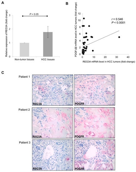For gene expression analyses, 88 surgically resected frozen HCC tumor and 88 paired non-tumor liver tissue samples were evaluated. The majority of patients (n = 71, 80.7%) were stage I according to the American Joint Commission on Cancer 8th edition HCC staging system. Eleven patients (12.5%) and six patients (6.8%) were stage II and stage III, respectively. No patient had major vascular invasion or lymph node/distant metastasis. The expression of REG3A was further determined in resected HCC and adjacent non-tumor tissues using qRT-PCR. The mean mRNA expression of REG3A was upregulated 1.8-fold in HCC tissues compared with non-tumor tissues (Figure 6A; p = 0.05). Among 88 HCC tumor tissues, the REG3A mRNA expression was upregulated in 46 samples (52.3%) as compared to non-tumor tissues, and positively correlated with PDGF-ββ (Figure 6B; Pearson’s coefficient = 0.546; p < 0.001). Immunohistochemical study using three human HCC tissues also revealed that the expression of REG3A was accompanied by an increased expression of PDGF receptor (PDGFR) (Figure 6C).