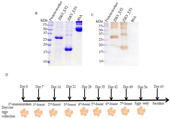 The antibody production in chickens was observed through immunization of His-fused recombinant proteins. The chicken received an intramuscular injection on a thigh of 50 micrograms (µg) mixture of the purified ZIKV_E F2 and ZIKV_E F3 proteins each 7 days for 56 days. A total of 50 µg of two ZIKV_E proteins was resuspended in filtered phosphate buffered saline (PBS) plus Freund’s adjuvant (Sigma-Aldrich, Inc., St Louis, MO, USA). The first shot was mixed with 11 µL of ZIKV_E F2 (34.705 µg), 4.7 µL of the ZIKV_E F3 (15.0447 µg), 484.3 µL of the filtered PBS, and then topped up with 500 µL of complete Freund’s adjuvant to make a mixture of 1 milliliter (mL). The immunization schedule was designed to run for 56 days (Figure 1D). The eggs were collected before and after immunization each week for purification (Figure 1D).