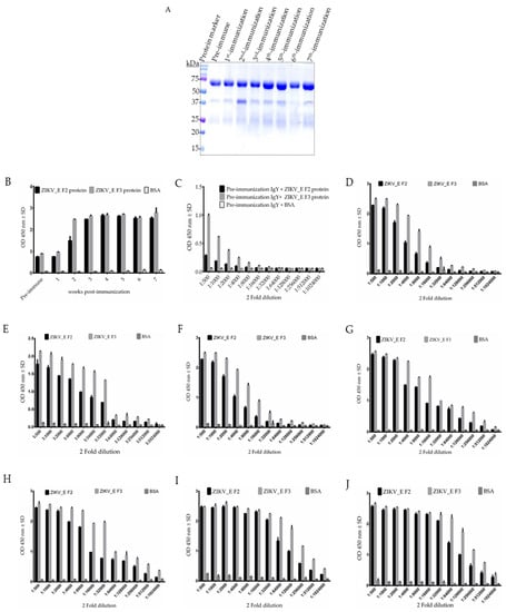 Characterization of purified immunoglobulin yolk (IgY) against ZIKV_E recombinant proteins. (A) Sodium dodecyl-polyacrylamide gel electrophoresis of a purified IgY antibodies. (B) The binding ability of purified ZIKV_E immunoglobulin yolk (IgY) antibodies from pre-immunization through seventh immunization on weekly basis. Immune response of (C) pre-immunization, (D) first immunization, (E) second immunization, (F) third immunization, (G) fourth immunization, (H) fifth immunization, (I) sixth immunization, and (J) seventh immunization was performed to assess the induced immune response before and after the final immunization.