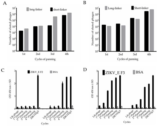 After infection by VCSM13 helper phages, the phages displaying scFv antibodies were used in the bio-panning steps. The phage eluted titers were measured as approximately 103 colony-forming units (cfu) in the first cycle against ZIKV_E F2 protein (Figure 3A). The titer increased by 1000 cfu in the second cycle, the pattern remained the same in third round, and it steadily increased to 106 cfu in the fourth cycle (Figure 3A). The phages displaying scFv with long-linker indicated a titer at 104 cfu in the first cycle, a small increase in the second, and then the titer steadily increased to 107 cfu in the third and fourth cycles (Figure 3A). On the other hand, the eluted phages were also tested against ZIKV_E protein. The phage containing scFv with short-linker showed 104 cfu, and then steadily increased above 106 cfu, whereas the phage containing long-linker started with 104, then decreased a small amount in second cycle, and steadily increased to 107 cfu in the fourth cycle (Figure 3B). A similar pattern was previously observed in our published work [29], which suggested that specific phage binders were successfully enriched from the start until the end of the bio-panning procedure. We further confirmed the results of the bio-panning process using ELISA. The amplified phages were added to the ELISA plate with wells coated with purified ZIKV_E recombinant proteins. The original phage antibody libraries were compared with phages amplified in the first through fourth rounds. The result indicated that the binding activity of harvested phages was significantly enhanced after the second panning in long-linker against ZIKV_E F2 proteins (Figure 3C). Those against ZIKV_E F3 proteins showed a steady increase up to the fourth round with the short-linker, whereas the long-linker produced sharp increase after first round and then plateaued from the second round onwards (Figure 3D).