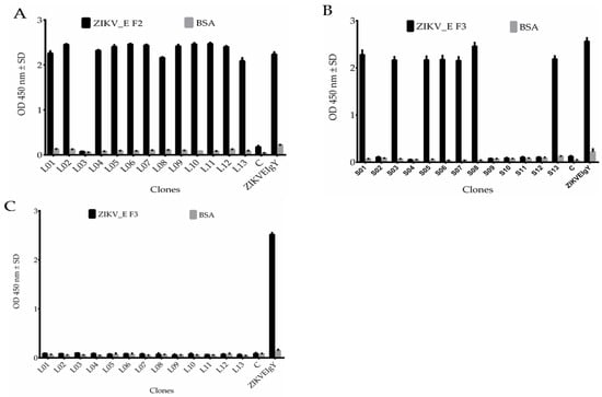 The binding ability of the phage-expressing anti-ZIKV_E scFv antibody was measured by ELISA. The 96 half-area well plates were coated with 10 µg/mL per 25 µL in each well of recombinant ZIKV_E proteins, and were incubated at 37 °C for 1 h. After incubation, the plate was blocked for 1 h at 37 °C with 5% skimmed milk dissolved in 1×PBS and washed six times with 1×PBST (1×PBS, 0.05% Tween-20). After 1 h blocking, the equal mixture of phage antibody with 5% skimmed milk 1×PBS was added at 25 µL per well and incubated at 37 °C for 2 h. Chicken anti-ZIKV_E IgY (seventh immunization) was used as a positive control, whereas BSA was used as a negative control. After incubation, the wells were washed six times with 1×PBST, followed by incubation with mouse anti-M13 HRP-conjugated antibody for 1 h at 37 °C. After washing six times, donkey anti-chicken IgY HRP-conjugated antibody (1/10,000 dilution) or rabbit anti-mouse IgG HRP-conjugated antibody (1/10,000 dilution) was added and incubated at 37 °C. After 1 h incubation, the wells were washed six times with 1×PBST, followed by development with 3,3′,5,5′-tetramethylbenzidine (TMB) (Sigma, Shanghai, China) for 20 min in the dark at room temperature. The reaction was stopped with 13 µL 1 N HCl solution in each well. The absorbances were read at 450 nm in a plate reader, and finally the data was analyzed with Graph Pad software version 8.0.