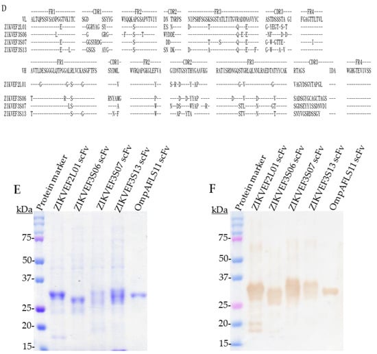 We analyzed the randomly selected scFvs and their gene sequences, and then compared them to the chicken germline sequence. A total of 19 scFv clones displayed good binding activities against the ZIKV_E-truncated antigens after selection (Figure 4A,B). However, the anti-ZIKV_E scFv with long-linker against ZIKV_E F3 protein did not have binding activities to ZIKV_E proteins (Figure 4C). Nevertheless, we managed to select four potential scFv antibodies with specific binding to ZIKV_E proteins that can be used in the detection of recombinant protein of Zika virus envelope in western blot, ELISA, and flow cytometry assays. After selection, the scFv gene sequences were also determined. The complementarity determining regions (CDRs) and the framework regions (FRs) showed different amino acid residues, which denote mutations. The CDR regions were responsible for the immunogen binding activities, which were revealed by mutation rates. The scFvs showed 20–100% and 0–19% mutation rates, respectively, in both light- and heavy-chains when compared to the chicken germline (Figure 4D and Table 2). These mutation rates indicated that anti-ZIKV_E scFvs antibodies elicited an immunogenic-driven chicken humoral immune response rather than a naturally induced naïve antibody response. Expression and purification levels in TOP10F’ Escherichia coli were analyzed using SDS-PAGE in order to determine their molecular weight in kilodaltons (Figure 4E); western blot analysis was used to confirm the expression of the ZIKV_E scFvs antibody proteins as shown in Figure 4F. According to the results, scFvs proteins were successfully expressed and purified.