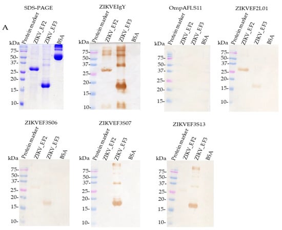 The ZIKV_E proteins were further analyzed using Coomassie blue-stained SDS-PAGE (Figure 5A). Mouse anti-His tag detection on western blot membrane confirmed the protein production (data not shown). The molecular masses of the two different ZIKV_E truncated proteins were ≈27 or ≈17 kDa, respectively (Figure 5A). No reactivity was detected against bovine serum albumin (BSA). ZIKVEF2L01 scFv, ZIKVEF3S06 scFv, ZIKVEF3S07 scFv, and ZIKVEF3S13 scFv recognized ZIKV_E truncated proteins in western blot (Figure 5A); the same pattern of binding activities was observed in ELISA assay (Figure 5B), especially ZIKVEF2L01 scFv. However, two scFvs (ZIKVEF3S06 and ZIKVEF3S13) showed different patterns of binding activities. This result suggested that the epitopes of these two scFvs antibodies on ZIKV_E F2 protein might have been exposed during the SDS-gel electrophoresis process, compared to native form protein in ELISA assay. A non-reactivity pattern of ZIKVEF3S07 scFv to ZIKV_E F2 protein was also observed both from western blot and ELISA assay (Figure 5A,B). ZIKVEIgY and anti-OmpAFLS11 scFv antibodies were used as positive and negative controls, respectively (Figure 5A,B).