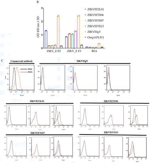 Characterization of binding specificity of anti-ZIKV_E scFv and polyclonal anti-ZIKV_E IgY antibodies. (A) Sodium dodecyl sulfate-polyacrylamide gel electrophoresis stained with Coomassie brilliant blue dye—lane 1: protein molecular weight marker, lane 2: ZIKV_E F2 protein, lane 3: ZIKV_E F3 protein, lane 4: BSA. The purified anti-ZIKV_E scFv antibodies (ZIKVEF2L01, ZIKVEF3S06, ZIKVEF3S07, and ZIKVEF3S13) were measured for their binding activities against two ZIKV_E recombinant proteins transferred on polyvinylidene difluoride (PVDF) membranes. Lanes 2: ZIKV_E F2 protein (27 kDa), lanes 3: ZIKV_E F3 protein (17 kDa). The bound scFv antibodies were detected using mouse anti-human influenza virus hemagglutinin (HA) tag antibodies (5000× dilution), followed by rabbit anti-mouse IgG HRP-conjugated antibodies (10,000× dilution). Anti-ZIKV_E IgY and anti-OmpAFLS11 scFv were used as positive and negative controls, respectively. (B) The purified scFv antibodies were analyzed for their ability to bind to ZIKV_E recombinant proteins immobilized on ELISA wells; the bars denote ZIKV_E F2 protein, ZIKV_E F3 protein, and bovine serum albumin (BSA). The assay was probed with ZIKVEF2L01 scFv, ZIKVEF3S06 scFv, ZIKVEF3S07 scFv, ZIKVEF3S13 scFv, ZIKVEIgY antibody (seventh immunization) as positive control, and OmpAFLS11 scFv as negative control. The scFv antibodies showed successful binding to antigens as indicated in the figures. (C) Flow cytometry analysis using the same antibodies plus 4G2 anti-flavivirus group antibody excluding anti-OmpAFLS11 scFv antibody.