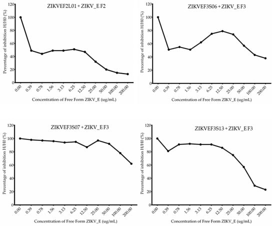 The assay further confirmed the binding abilities of anti-ZIKV_E scFv antibodies. First, the checkerboard titration was performed to determine the appropriate concentration for use in the subsequent assay (Figure S3). After antibody titration, 20 µg/mL was chosen as the concentration to use. Each scFv antibody was incubated with the free form of the ZIKV_E recombinant protein separately, and 1 h later it was added to the ELISA wells plate. The percentage of inhibition was calculated using optical densities in the absence of the free form of ZIKV_E recombinant proteins divided by the presence of serially diluted concentration of the free form of ZIKV_E recombinant proteins. The dissociation constant (KD) of each scFv was calculated using the method of the Klotz plot (Table 3). As indicated, the binding abilities of these scFvs were gradually decreased in a dose-dependent manner (Figure 6). The results showed that the KD values of ZIKV_E scFv were 1.49 × 10−5 to 2.04 × 10−8 M, which suggest that ZIKVEF2L01 scFv had the strongest affinity (2.04 × 10−8 M) whereas ZIKVEF3S07 scFv had the weaker affinity (1.49 × 10−5 M) to the ZIKV_E protein. Nevertheless, these results suggest that ZIKV_E scFv antibodies had the binding affinity for recombinant ZIKV_E-truncated proteins.