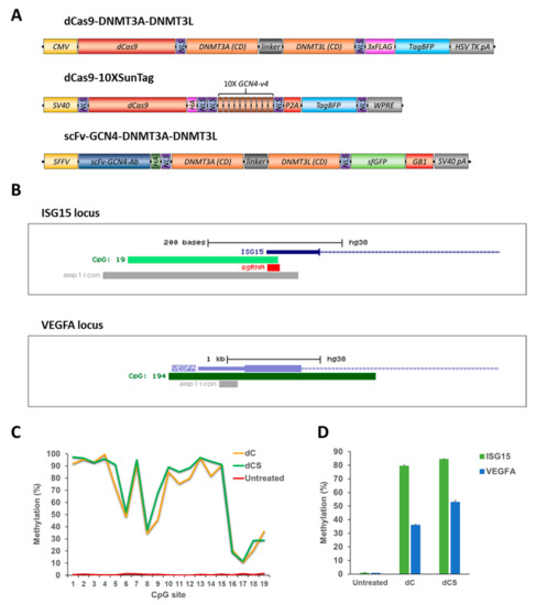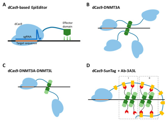 - Huang, Y.-H.H.; Su, J.; Lei, Y.; Brunetti, L.; Gundry, M.C.; Zhang, X.; Jeong, M.; Li, W.; Goodell, M.A. DNA epigenome editing using CRISPR-Cas SunTag-directed DNMT3A. Genome Biol. 2017, 18, 176. [Google Scholar] [CrossRef] [PubMed]