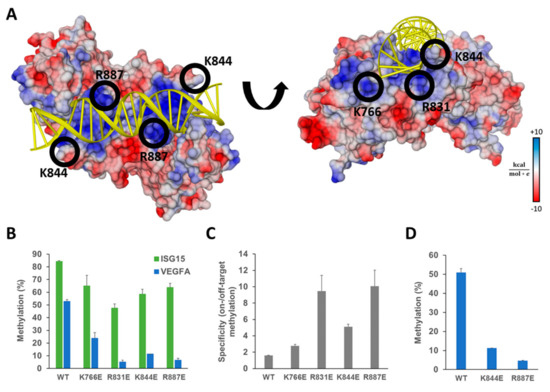 Ab-3A3L containing DNMT3A mutants with reduced DNA binding shows lower off-target methylation but retains most of the on-target activity. (A) Crystal structure of the DNMT3A-DNA complex (pdb 5YX2, [36]) showing the DNA (yellow) bound to the central dimeric DNMT3A catalytic domain colored according to the surface charge (blue positive, red negative). Positively charged residues on the protein surface (blue patches) interact with the negatively charged DNA phosphodiester backbone. Amino acids K766, R831, K844, and R887 were selected for mutagenesis and replaced by glutamic acid to reduce the strength of the protein–DNA interaction. (B) DNA methylation of the target (ISG15) and off-target (VEGFA) regions analyzed by targeted bis-seq in HEK293 cells using the dCS system with ISG15 sgRNA and DNMT3A wild type and mutants in Ab-3A3L. Results for the wild type DNMT3A are taken from Figure 2D and shown for comparison. Data present the mean of two independent experiments and error bars show the standard deviation. p-Values for comparison of the off-target activity of the mutants with wild type were 9.36 × 10−3 (K766E), 4.19 × 10−4 (R831E), 2.69 × 10−4 (K844E), and 5.05 × 10−4 (R887E) (one-sided t-test assuming unequal variance based on the experimental repetitions). (C) The specificity of the EpiEditors calculated as a ratio of the on- versus off-target DNA methylation based on the data of (B). (D) Off-target methylation analyzed at the VEGFA CGI for Ab-3A3L containing wild type and mutated DNMT3A co-transfected with dCS and the scrambled sgRNA coding vector. See also Figure S2.