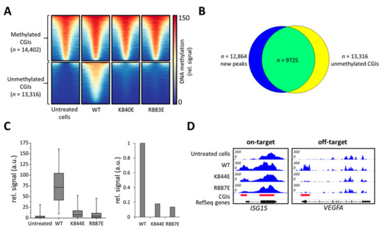 In untreated cells, the 27,718 CGIs in the human genome were subdivided based on their methylation signal into two groups, unmethylated (n = 13,316) and methylated (n = 14,402) (Figure 4A). Strikingly, a strong increase in the MBD2-pulldown DNA methylation signal was observed in cells transfected with the wild type construct. Peak calling identified 12,864 new MBD-seq peaks compared to untreated cells, out of which 10,921 were located in CGIs (Figure S3) and 9725 peaks overlapped with originally unmethylated CGIs (Figure 4B). Therefore, we focused our further analysis on unmethylated CGIs. In contrast to wild type DNMT3A, both tested mutants, K844E and R887E, showed only a slight increase in DNA methylation levels in untargeted CGIs (Figure 4A,C). For a quantitative comparison, the MBD-seq signals in unmethylated CGIs were averaged showing a 6-fold reduction in methylation for K844E and even a 7.8-fold reduction for R883E compared to the wild type (Figure 4C). Analysis of the targeted ISG15 locus confirms that both mutants were able to introduce a methylation signal at the target site despite their strongly reduced activity at off-target loci like the VEGFA promoter (Figure 4D, Figure S4). These effects are even more pronounced in other off-target loci like ACTB or GAPDH (Figure S5). Quantitative analysis of the MBD-seq peak areas confirmed the strong improvement of K844E and R887E in editing specificity (Figure S4). Thus, the DNMT3A variants designed here showed a high specificity of targeted DNA methylation due to strongly reduced off-target methylation.