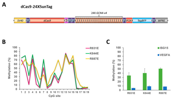 The dCas9-24XSunTag does not increase on-target DNA methylation. (A) Scheme of the dCas9-24XSunTag (dCS24) vector used in this study. (B) DNA methylation of individual CpG sites (on the x-axis) of the ISG15 region determined by targeted bis-seq after treatment of HEK293 cells with the dCS24, ISG15 sgRNA, and Ab-3A3L with the R831E, K844E, and R887E mutations in the DNMT3A part. Data from a single representative experiment are shown. (C) A mean methylation of the target (ISG15) and the off-target (VEGFA) regions analyzed by targeted bis-seq of HEK293 based on two independent experiments. Error bars show standard deviations. Note that higher methylation levels were observed with the dCas9-10XSunTag with the same Ab-3A3L mutants (Figure 3B). See also Figure S2.