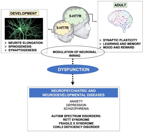 The 5-HT7R, the last discovered member of the 5-HTR family [33,34], has always been the subject of intense investigation, due to its high expression in functionally relevant regions of the brain [35,36]. Accordingly, several recent data have elucidated its role in a wide range of physiological functions in the mammalian CNS and also in peripheral organs [37]. Interestingly, emerging findings indicate that 5-HT7R is involved in brain plasticity, being one of the players contributing not only to shape brain networks during development but also to remodel neuronal wiring in the mature brain, thus controlling higher cognitive functions (see Section 2.2 and Section 2.3). Therefore, this receptor is currently considered as potential target for the treatment of several neuropsychiatric and neurodevelopmental disorders, (as discussed in Section 3), also in view of the fact that its ligands have a wide range of neuropharmacological effects [38,39].
