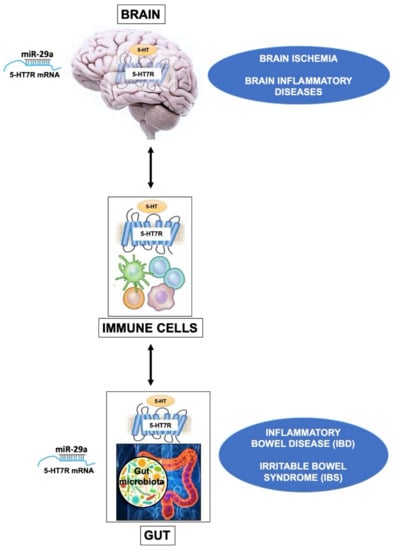 Altogether, the reported findings on the 5-HT7R signaling in the CNS, GI tract and immune system suggest the involvement of this receptor in inflammatory and immune-mediated disorders affecting the gut and brain (Figure 2). For instance, as mentioned above, two very recent studies showed that 5-HT7R is a direct target of miR-29a in the brain, as well as in the intestine [63,111], suggesting that this miRNA might modulate 5-HT7R expression in both tissues in a coordinated way.