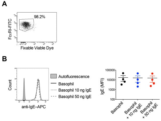 The viability of basophils following isolation from the buffy bags of healthy donors was in the range of 98–99% as analyzed by fixable viable dye (FVD) staining (Figure 1A). Previous study has reported that ~97% (on median basis) of high-affinity FcεRI on the basophils are occupied with IgE [29]. Other reports have also suggested that the expression of FcɛRI on the basophils is directly related to IgE levels [22,30]. As shown in the Figure 1B, basophils from the healthy donors displayed high levels of surface-bound IgE. Further, to explore if FcɛRI on basophils are almost saturated with IgE, we incubated the basophils with exogenous recombinant human IgE for 30 min and followed by surface staining for IgE on the basophils by flow cytometry. However, there were no major differences in the intensity of IgE on the basophils if they were incubated with additional IgE (10 or 50 ng) or not (Figure 1B), thus indicating that all FcɛRI on basophils are already saturated/occupied by IgE.