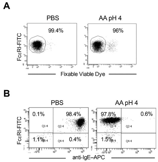 Stripping of surface IgE antibodies bound to FcεRI of basophils by acetic acid buffer (pH 4). Basophils were incubated on ice for 5 min either with phosphate buffered saline (PBS) or ice-cold acetic acid buffer pH 4 (0.05 M acetate, 0.085 M NaCl, 0.01 M EDTA and 0.03% human serum albumin) (AA pH 4). Cells were then washed and proceeded with phenotype analyses by flow cytometry. (A) The viability of cells immediately following AA pH 4 treatment as analyzed by fixable viable dye staining. (B) Efficacy of stripping of basophil surface-bound IgE by AA pH 4 (right panel) as analyzed by surface staining of IgE and analyses by flow cytometry. Representative data from four donors are presented.