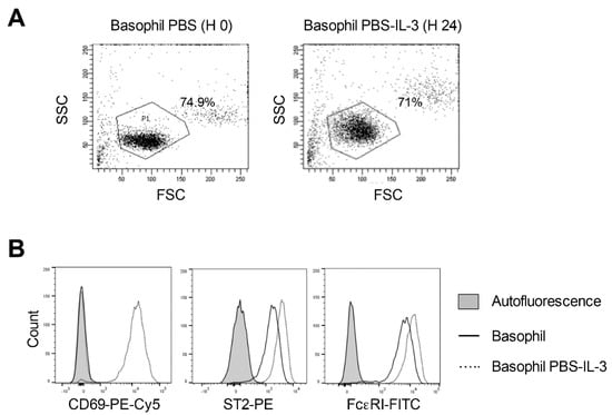 Response of the phosphate buffered saline (PBS)-treated human peripheral blood basophils to IL-3 stimulation. Basophils were incubated on ice for 5 min with PBS. Cells were then washed and cultured in serum-free X-VIVO 15 medium (0.1 × 106 cells/well per 200 µL) in 96-well U-bottomed plate along with IL-3 (100 ng/0.5 million cells) for 24 h. (A) The forward and side scatter plot of the basophils immediately following PBS treatment and following 24-h culture in the presence of IL-3. (B) Histogram overlays showing the expression of basophil activation markers CD69, ST2 and FcεRI in PBS-treated basophils cultured for 24 h in IL-3. Representative data from four donors are presented.
