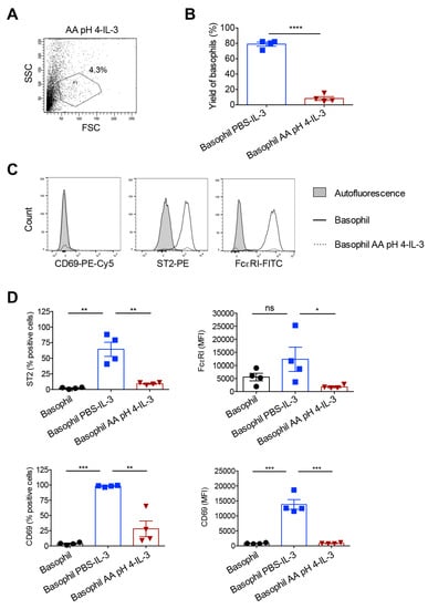 Therefore, as a first step, we cultured PBS or acetic acid buffer (pH 4)-treated basophils in IL-3 for 24 h. Analyses of basophils by flow cytometry revealed that PBS-treated basophils remain highly viable after 24 h culture and we observed only minor changes in the cell yield (Figure 3A). In addition, IL-3 induced or enhanced the expression of various activation markers on basophils such as Cluster of Differentiation 69 (CD69), Suppression of Tumorigenicity 2 (ST2) and FcεRI (Figure 3B).
