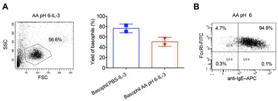 Acetic acid buffer pH 6 improves the viability of basophils but is ineffective to strip off IgE from the basophils. Basophils were incubated on ice for 5 min with ice-cold acetic acid buffer pH 6 (AA pH 6). Cells were then washed and cultured in serum-free X-VIVO 15 medium (0.1 × 106 cells/well per 200 µL) in 96-well U-bottomed plate along with IL-3 (100 ng/0.5 million cells) for 24 h. (A) The forward and side scatter plot of AA pH 6-treated basophils following 24-h culture in IL-3 (left panel) and the yield of basophils (mean ± SD, n = 2 donors) (right panel). The values were calculated based on the percentage of cells in the P1 gate of forward and side scatter plot. (B) Efficacy of stripping of basophil surface-bound IgE by AA pH 6 as analyzed by surface staining of IgE and analyses by flow cytometry.