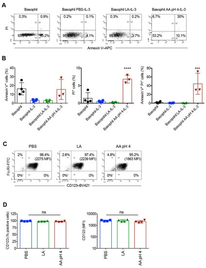 Effect of acetic acid buffer pH 4 (AA pH 4) and lactic acid (LA) treatment on the viability of basophils cultured for 24 h in the presence of IL-3. The viability of basophils was analyzed by Annexin V and PI staining. (A) Representative dot plots and (B) data (mean ± SD, four experiments from two donors) are presented. In AA pH 4-treatment condition, no viable cells were obtained in one of the experiments. (C,D) The expression of CD123 (% positive cells and median fluorescence intensity, MFI) on the basophils as analyzed by flow cytometry immediately following treatment of cells with PBS, LA or AA pH 4. (C) Representative dot plots and (D) data (mean ± SD, four experiments from two donors) are presented. *** p < 0.001; **** p < 0.0001; ns, not significant; one-way ANOVA with Tukey’s multiple comparison test.
