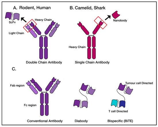Common Antibody and antibody fragments which can be generated to validate target antigens. (A) Upon antigenic challenge, full sized dual chain antibodies are produced in model systems such as rodents and humans. The antibody fragment generated is a single chain variable fragment (scFv). (B) Camelids and sharks produce single, heavy chain only antibodies, with a nanobody antibody fragment. (C) The antibody fragments discussed in this review include diabodies—two fused scFvs or nanobodies of the same antibody, and bi-specific antibodies made of two fused scFvs with different specificities.