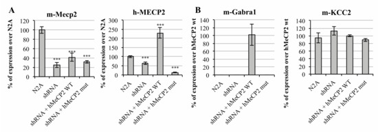 In vitro analysis of MeCP2 altered activity over γ-aminobutyric acid (GABA) ionotropic receptors’ expression. Bar graph representing the relative expression of (A) mouse MECP2 (mMeCP2), human MECP2 (hMeCP2) and (B) mouse GABRA1, and mouse KCC2, measured by qRT-PCR under four different transfection scenarios, namely: non-transfected cells (N2A), transfected with the shRNA-anti-(3′UTR)Mecp2 (shRNA) and co-transfected with the shRNA-anti-(3′UTR)Mecp2 and wt, or c.763C>T mutated MeCP2 carrying plasmids. Error bars represent the standard deviation of the average values. Statistical significance was calculated through a Student’s t-test (*** p-value < 0.001).