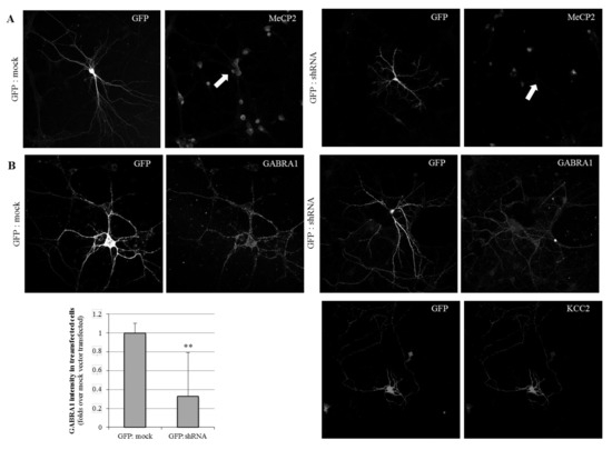 Immunofluorescence analysis of MeCP2, GABRA1, and KCC2 expression in cortical primary neuronal cultures. Cells were transfected with either GFP and mock DNA, or GFP and shRNA-anti-(3′UTR)Mecp2. Images show neurons at DIV11. Images were taken at 63x with constant time of exposure. Transfected neurons were labeled with anti-GFP and anti-Mecp2 (A). For the GABRA1 and KCC2 immunostaining (B), different neurons are shown. The quantification of the mean GABRA1 immunosignal in mock and shRNA transfection conditions is shown in the bar graph. n = 10 different neurons, from two independent cultures. ** refer to p-value < 0.01.