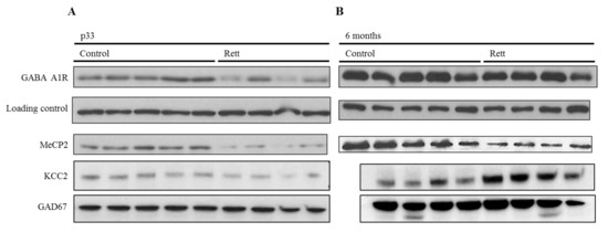 Developmental expression analysis of GABAergic proteins in the MeCP2−/+ mouse brain cortex. Representative Western blot analysis of the GABAA-A1R, KCC2, GAD67, and MeCP2 E1 expression in the adult cortex of female Rett and control mice. (A) Expression in p33-pre-symptomatic mice (control vs. pre-symptomatic Rett mice). Vinculin was used as a loading control. (A) Expression in six-months old mice (control vs. symptomatic Rett mice). Both Western blots (A,B) are cropped stripes of two different membranes each, and incubated with each antibody separately (target protein and loading control respectively). Each lane is a different animal. Representative blots shown.