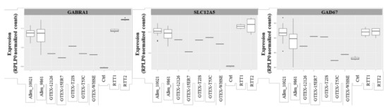 Upon the validation of the RNAseq experiment, as described in Materials and Methods, and because of the lack of healthy control samples, the raw data from the Rett patients’ necropsies were compared with the RNAseq data of the control individuals, available at GTEx Portal [25]. We crossed our data with the data derived from five controls (two females and three males), all aged 20 to 29, being the closest age-matched group to our patients (10 to 15 years old at exitus). All of the data were normalized with housekeeping genes RPLP0 and GUSB.