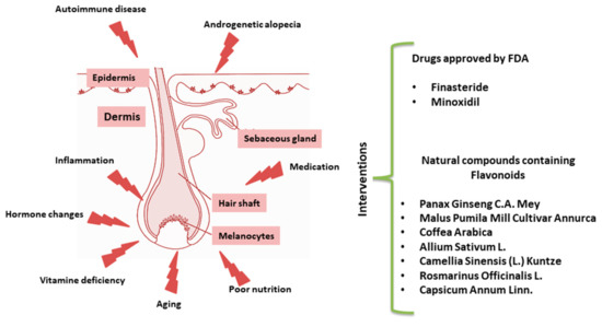 Polyphenolic phytochemicals also display several pharmacological properties and serve as a rich reservoir for drug discovery. Currently, a limited number of studies reported the role of flavonoids in patients with alopecia [40].