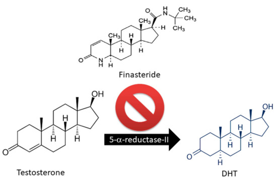 Only two drugs are currently approved by the U.S. Food and Drug Administration (FDA) for the treatment of AGA: Finasteride and Minoxidil (MXD) [17,18,19]. Finasteride is largely used as an oral drug for the treatment of androgen-related hair disorders due to its inhibitory activity on 5α-R [18,19,20] (Figure 2).