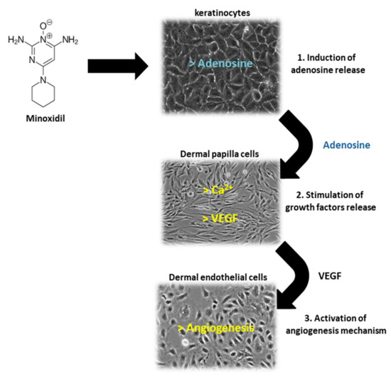 Schematic representation of Minoxidil (MXD) action on different cells of HF: keratinocytes, dermal papilla cells and dermal microvascular endothelial cells. (1) MXD induces the release of adenosine by follicle keratinocytes, (2) adenosine stimulates the release of growth factors (VEGF) by follicle dermal papilla cells (FDPC), (3) VEGF promotes angiogenesis mechanism in dermal microvascular endothelial cells.