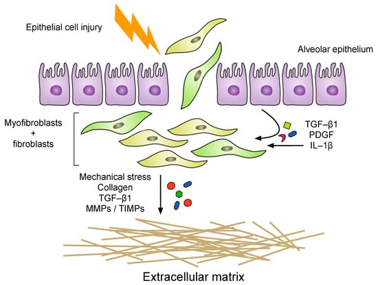In this environment, activated platelets, damaged epithelial cells, and recruited inflammatory cells release more pro-fibrotic growth factors and such TGF-β1 drive the fibrotic response. TGF-β1 is considered the driving force of fibrosis as it has multiple properties including activation of fibroblasts, epithelial cell differentiation via epithelial-mesenchymal transition (EMT), and stimulation of the expression of pro-inflammatory cytokines such as IL-1β to further enhance the fibrotic response [56].