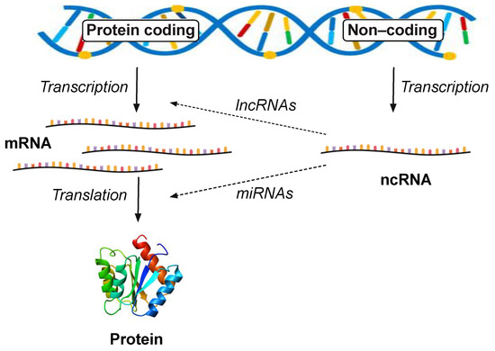 Initial data from the Human Genome Project indicated that there were approximately 30,000 to 40,000 protein coding genes in the human genome [100]. However, this estimate was significantly reduced to 20,000 to 25,000 in the final draft published three years later [101]. In terms of the total length of the human genome, this meant that just 1% to 2% codes for protein coding genes. Although the function of the remaining DNA is currently an area of investigation, we know that much of this is transcribed into RNA which is not translated, and therefore is classified as “non-coding RNA” (ncRNA) [102,103]. Despite being initially considered as “junk”, ncRNAs are now known to have multiple biological functions and play a significant role in health and disease [104,105].