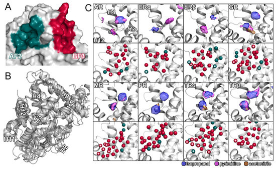 Here, we applied cosolvent MD simulations, hydration site prediction, and molecular docking to a set of eight NRs including AR, ER, ER, GR, MR, PR, and the thyroid receptors and (TR and TR). We assessed a large share of compounds reported to modulate NR signaling through either AF-2 or BF-3 of the respective receptor.