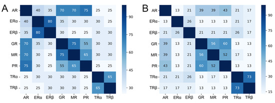 The structures of LBD of AR, ER, ER, GR, MR, PR, TR, and TR feature a similar conserved fold (Figure 1B). We conducted a sequence-based analysis of residues in the 5 Å range around a cocrystallized ligand and compared those residues with respect to their similarity among all receptors (Figure 2). While the analysis revealed similarities between the isoforms of the ERs and TRs that were expected, receptors with high identity in both sites included AR, GR, MR, and PR. We observed values up to 75% between MR and GR, as well as PR and AR, in the AF-2, which raises serious concerns regarding off-target binding for ligands targeting either of these receptors. In slight contrast to the previously reported conservation degree in the literature [2,9], our comparably high percentages could be explained by the different definitions of conservation and binding site residues. Compared to the other receptors, the TRs offer a good potential for selective binding to either site, but particularly, for BF-3. Overall, the results suggest that the BF-3 site offers a higher potential for the design of selective inhibitors due to the generally lower values in similarity among the receptors compared to the AF-2. The conservation of residues from a three-dimensional perspective can be assessed in Figures S1 and S2.