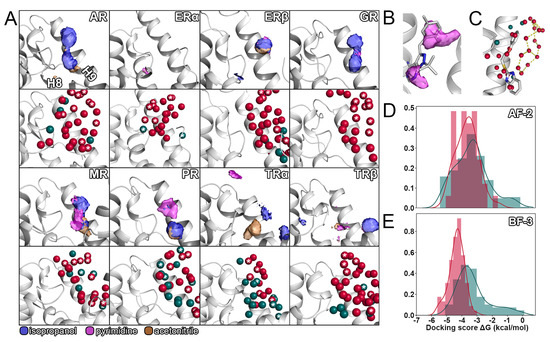 As mentioned before, the BF-3 site of the studied NRs displayed a higher degree of heterogeneity regarding the cosolvent densities (Figure 3A). While AR, GR, and to some degree MR and PR showed a somehwat comparable pattern of probe densities, both ERs and TRs presented a high degree of diversity among them despite being most closely related based on their sequence. Most evidently, the BF-3 site of ER was barely mapped by the probe molecules at the selected isovalue (twelve times the density in bulk solvent) and only presented a slight density of pyrimidine, indicating a region for an aromatic moiety. The same region in ER was mapped by isopropanol, suggesting the placement of an amphipathic, as opposed to an aromatic, functional group in this isoform, to achieve selective ligand–protein interactions. The lack of probe density at the ER BF-3 site points towards poor druggability of the site [47], which is indirectly supported by experimental results since inhibitors directed against the AR did not inhibit ER [13]. The density maps of the BF-3 site of both TRs substantially differ from the ones of other receptors, which reduces the odds for the cross-binding of compounds harboring the proposed density-based pharmacophores. Even though the TR shared densities for isopropanol and acetonitrile with the TR, the latter displays additional densities in distal regions of the site and a pronounced density of acetonitrile in the center. Therefore, an amphipathic group, potentially containing a nitrogen atom, would offer the potential to increase compound selectivity between the two TRs. Moreover, the density maps revealed a high identity between AR and GR, particularly regarding the regions mapped by isopropanol. In contrast, the MR and PR presented distinct differences despite the comparable degree of conservation among all four receptors.