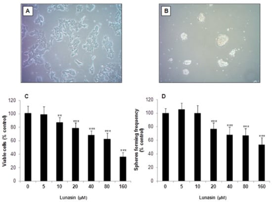 In this study, the human HCT-116 cell line was grown in monolayer as parental CRC cells (Figure 1A) and used for the enrichment of tumor-derived colon-spheres (Figure 1B). We first examined the growth of adherent HCT-116 cells exposed to lunasin. HCT-116 cells were treated with serial concentrations of synthetic lunasin (5–160 μM) for 72 h and the number of viable cells was assessed by the 3-(4,5-dimethylthiazol-2-yl)-2,5-diphenyl tetrazolium bromide (MTT) assay. As shown in Figure 1C, lunasin showed cell proliferation inhibitory properties with increasing effects at higher doses. Hence, treatment with 10 µM lunasin was able to induce a significant reduction on cellular growth (12.9%, p < 0.01) compared to control cells. The cytotoxic effect increased up to the highest concentration used (64.1%, p < 0.001). The IC50 value, expressed as the peptide concentration needed to inhibit 50% of cell number, was 107.5 ± 1.9 µM. It had been previously demonstrated that lunasin is able to induce cytotoxicity in colon cancer HCT-116, HT-29, KM12L4, and RKO cells, with IC50 values of 26.3, 61.7, 13.0, and 21.6 µM, respectively, while it was no toxic for colon fibroblasts CCD-33Co []. While these authors used purified lunasin (~90%) from defatted soybean flour, in our study we have assessed the effects of synthetic lunasin. The higher IC50 value found in our study might be due to differences in the secondary and tertiary structures between plant-purified lunasin and the synthetic peptide. Additionally, other compounds present in the natural preparation could be responsible for the observed change in the inhibitory potency. In this regard, synthetic lunasin has been shown to suppress the growth of breast cancer MDA-MB-231 cells with a reported IC50 value of 181.0 µM [].