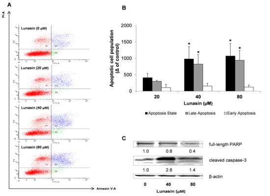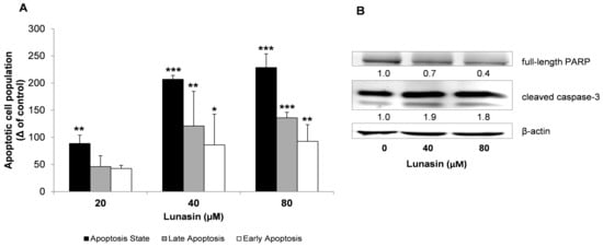 Figure 2 presents the apoptotic state of adherent HCT-116 cells under control and lunasin-treated conditions for 72 h. The apoptotic populations of cells treated with the peptide were significantly increased (Figure 2A). Lunasin at 20, 40 and 80 µM induced 1.3, 1.7 and 1.8-fold increase of total apoptotic cells, respectively, compared to control. In the case of lunasin at 40 and 80 µM, cells both in the early and late apoptotic stages were significantly enhanced. The apoptosis-involved inhibitory role of lunasin against HCT-116 cells was further addressed by the immunoblotting study of the molecular proteins PARP and caspase-3. PARP is responsible for the regulation of many cellular functions, such as key events supporting cell viability and DNA repair []. PARP degradation has been shown to facilitate cellular disassembly, and serve as a marker of cells undergoing apoptosis, with this protein being the main cleavage target on the activity of the apoptotic trigger caspase-3 []. As shown in Figure 2B, lunasin activated the cleavage of caspase-3 and, consequently, the protein level of full-length PARP was decreased in lunasin-treated cells. This might be accompanied to increased expression of cleaved PARP, a hallmark of apoptosis, as we found previously []. In this line, Dia and de Mejia found that lunasin was able to activate the apoptotic mitochondrial pathway in HT-29 and KM12L4 cells, as evidenced by the modulation of Bcl-2/Bax family of proteins, nuclear clusterin, cytochrome c, and caspases-activity [,]. Similar apoptosis-related properties have been reported for this peptide against the growth of leukemia L1210 cells [], and breast cancer MCF-7 and MDA-MB-231 cells [,].