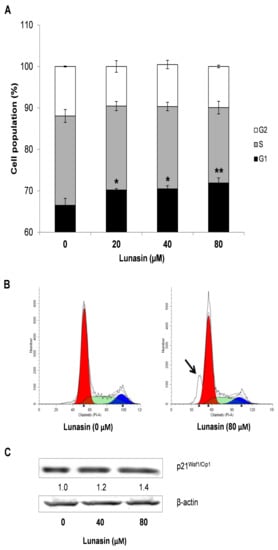 Effect of lunasin on cell cycle progression of HCT-116 cells. Cells were treated with lunasin at the indicated concentrations for 72 h, and harvested for cell cycle analysis and Western immunoblotting. (A) Cell cycle distribution was assessed by flow cytometry using PI staining. Results, presented as percentage of cells in G1, S, and G2 phases, are means ± standard deviation (SD) of the replicates of experiments carried out. * (p < 0.05), ** (p < 0.01) significantly different from control. (B) Representative images of lunasin-induced increase in the sub-GO/G1 cell population (black arrow). (C) Expression of p21Waf1/Cip1 protein determined by Western Blot. The numbers underneath the blots represent band intensity that was normalized to β-actin and measured by Image J software (means of duplicates, and standard deviations within ± 15% of the means were not shown). β-actin was served as an equal loading control for cytosolic fraction.