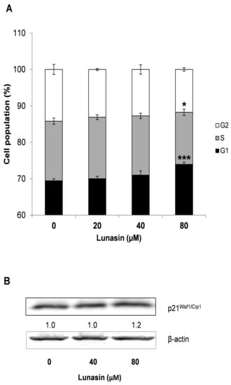 Effect of lunasin on cell cycle progression of colon tumorspheres. Cells were treated with lunasin at the indicated concentrations for 7 days, and harvested for cell cycle analyses and Western immunoblotting. (A) Cell cycle distribution was assessed by flow cytometry using PI staining. Results, presented as percentage of cells in G1, S, and G2 phases, are means ± standard deviation (SD) of the replicates of experiments carried out. * (p < 0.05), *** (p < 0.001) significantly different from control. (B) Expression of p21Waf1/Cip1 protein determined by Western Blot. The numbers underneath the blots represent band intensity that was normalized to β-actin and measured by Image J software (means of duplicates, and standard deviations within ± 15% of the means were not shown). β-actin was served as an equal loading control for cytosolic fraction.