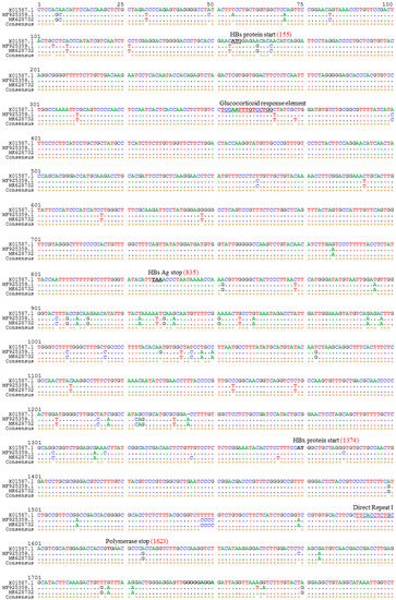 - Li, M.S.; Lau, T.C.K.; Chan, S.K.P.; Wong, C.H.; Ng, P.K.S.; Sung, J.J.Y.; Chan, H.L.Y.; Tsui, S.K.W. The G1613A mutation in the HBV genome affects HBeAg expression and viral replication through altered core promoter activity. PLoS ONE 2011, 6, e21856. [Google Scholar] [CrossRef] [PubMed]