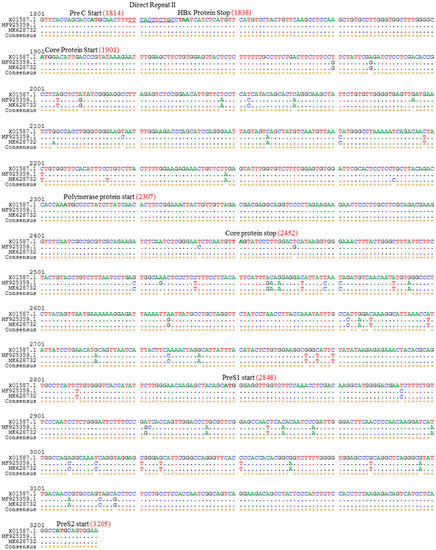 - Shaha, M.; Sarker, P.K.; Hossain, M.S.; Das, K.C.; Jahan, M.; Dey, S.K.; Tabassum, S.; Hashem, A.; Salimullah, M. Analysis of the complete genome of hepatitis B virus subgenotype C2 isolate NHB17965 from a HBV infected patient. F1000Research 2018, 7, 1023. [Google Scholar] [CrossRef] [PubMed]