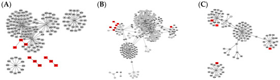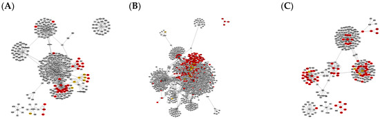 Graph clusters from StringDB showing unique difference networks between the intersection of all three disease-type constructed networks and each type-specific network with (A) general glioma, (B) glioblastoma multiforme and (C) low-grade astrocytoma. Graphs were rendered with Prefuse Force Directed Layout, clustered by ClusterOne (grey: outlier, yellow: overlap, red: cluster).