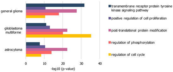The difference networks from unique nodes to each sample dataset, isolated by subtraction from the intersection of all three sample networks, were used for further GO analysis to highlight significant biological functions. Exemplary GO-terms with low p-values within all three sample networks are presented in Figure 3 and Table S1. The general glioma network comprises 219 nodes related to transmembrane receptor protein tyrosine kinase signaling pathway with higher significance compared to other sample networks. The GBM network comprises 446 nodes related to cell cycle regulation at highest significance in comparison to other sample networks. The low-grade astrocytoma network does not further show any biological function unique to its disease subtype in comparison to general glioma or GBM.