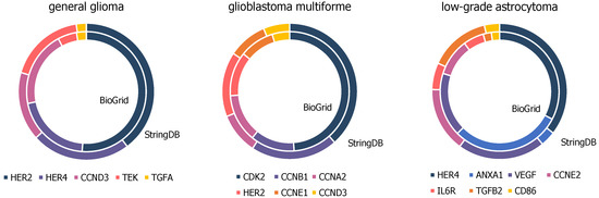 There are several matching genes within the top hub nodes of networks constructed by BioGRID compared to the far smaller ones by StringDB, presented in Figure 5 and further details in Tables S2–S4. Top hub nodes from glioblastoma multiforme networks contain six matches, namely cyclin dependent kinase 2 (CDK2), cyclin A2 (CCNA2), cyclin B1 (CCNB1), erb-b2 receptor tyrosine kinase 2 (HER2), cyclin E1 (CCNE1), and cyclin D3 (CCND3). Five out of the ten top hub nodes from general glioma networks from StringDB and BioGRID are matching genes containing erb-b2 receptor tyrosine kinase 2 (HER2), erb-b2 receptor tyrosine kinase 4 (HER4), cyclin D3 (CCND3), TEK tyrosine kinase (TEK), and transforming growth factor alpha (TGFA). Seven out of the ten top hub nodes from both BioGRID and StringDB constructed networks of low-grade astrocytoma samples accord with each other, namely erb-b2 receptor tyrosine kinase 4 (HER4), annexin A1 (ANXA1), vascular endothelial growth factor A (VEGFA), cyclin E2 (CCNE2), interleukin 6 receptor (IL6R), transforming growth factor beta 2 (TGFB2), and CD86 molecule (CD86).