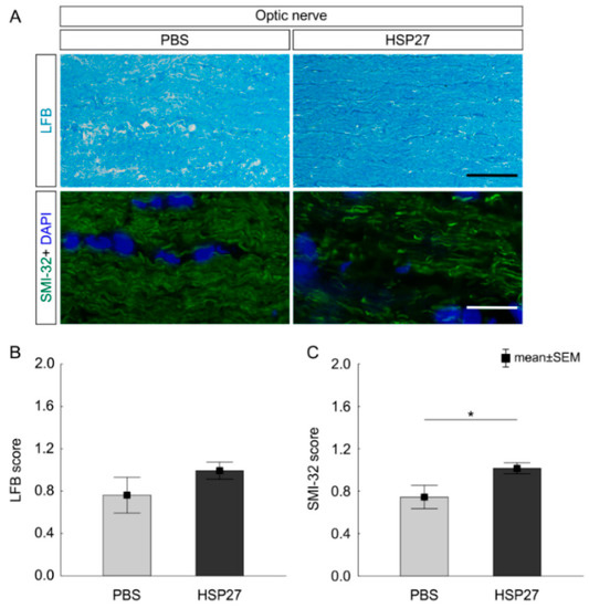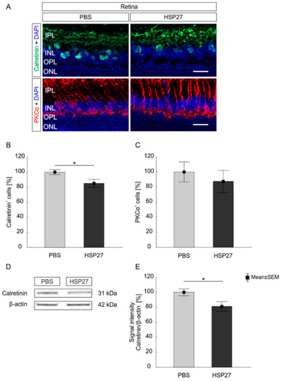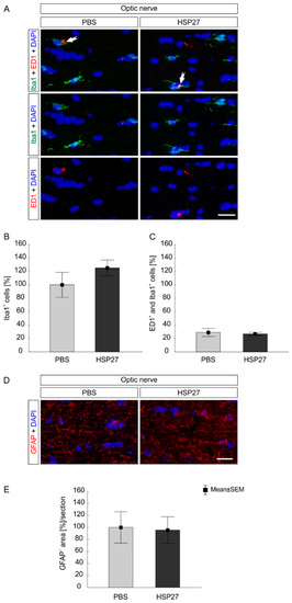 - Krueger-Naug, A.M.; Emsley, J.G.; Myers, T.L.; Currie, R.W.; Clarke, D.B. Injury to retinal ganglion cells induces expression of the small heat shock protein hsp27 in the rat visual system. Neuroscience 2002, 110, 653–665. [Google Scholar] [CrossRef]