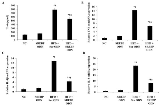 SREBP decoy ODN significantly inhibits the pro-inflammatory cytokines in the HFD-induced hyperlipidemic mouse model (n = 6). (A) ELISA results demonstrate that SREBP decoy ODN inhibits the IL-6 expression in hyperlipidemic mice. (B–D) Real-time PCR results show that SREBP decoy ODN inhibits expressions of TNF-α, IL-1β, and IL-8. NC, normal control group; SREBP ODN, group treated with SREBP decoy ODN; HFD + Scr ODN, HFD fed group treated with scrambled decoy ODN; HFD + SREBP ODN, HFD fed group treated with SREBP decoy ODN. * p < 0.05 compared to the NC group. † p < 0.05 compared to the SREBP ODN group. ‡ p < 0.05 compared to the HFD + Scr ODN group.