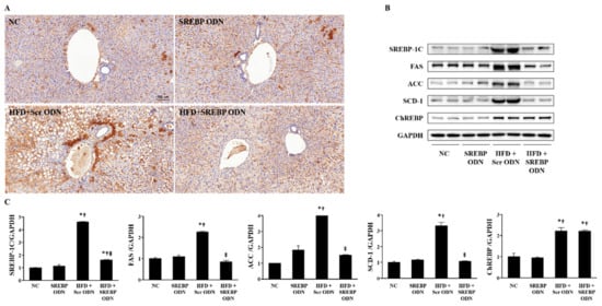 SREBP decoy ODN significantly inhibits cholesterol metabolism and fatty acid metabolism in the HFD-induced hyperlipidemic mouse model (n = 6). (A) Immunohistochemical staining results show that SREBP decoy ODN inhibits expression of HMGCR. (B) Western blot results show that SREBP decoy ODN inhibits expression of SREBP-1c, FAS, ACC, SCD-1. (C) The expression levels of the protein from quantification of these images by Image J. Representative images from each group. Scale bar = 100 μm. NC, normal control group; SREBP ODN, group treated with SREBP decoy ODN; HFD + Scr ODN, HFD fed group treated with scrambled decoy ODN; HFD + SREBP ODN, HFD fed group treated with SREBP decoy ODN. * p < 0.05 compared to the NC group. † p < 0.05 compared to the SREBP ODN group. ‡ p < 0.05 compared to the HFD + Scr ODN group.