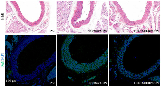 To understand the effects of SREBP decoy ODN further, we examined the effect of SREBP decoy ODN on the aortas of the hyperlipidemic mice. Pathological evaluations of aortic lesions were carried out. Consecutive cross-sections of cuffed descending aortas stained with H&E and immunofluorescence revealed the induction of hyperlipidemic lesion formation (Figure 5). The HFD + Scr ODN group showed a larger number of hyperlipidemic lesions in the aorta compared to the NC group. In the HFD + Scr ODN group, nearly all the animals developed fatty streaks in their aorta with an accumulation of lipids localized mainly in the areas subjacent to the endothelium. However, SREBP decoy ODN treatment changed the size of the hyperlipidemic lesions in the aortas, suggesting that SREBP decoy ODN exerted an apparently protective hyperlipidemic action. Furthermore, immunofluorescence staining results show that SREBP decoy ODN inhibits the expression of FAS in the aortas of HFD-induced hyperlipidemic mice. These results were consistent with the present study on mice livers.