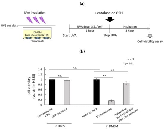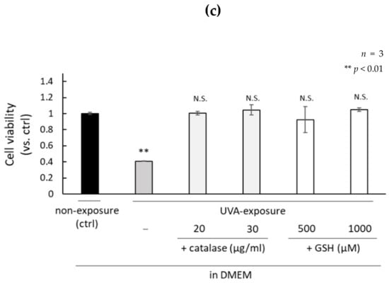 The oxidative stress of fibroblasts exposed to UVA in DMEM, which contains amino acids, vitamins, glucose, and buffer components, or in HBSS, which contains only glucose and buffer-related components, were compared. UVA irradiation conditions are shown in Figure 1a. The cell viability of fibroblasts cultured in DMEM exposed to UVA decreased significantly, but remained at the same level as non-irradiated fibroblasts cultured in DMEM when the DMEM was replaced with fresh DMEM immediately after the UVA exposure (Figure 1b). We previously reported that H2O2 generated by UVA exposure of DMEM induces the senescence of fibroblasts [19]. Therefore, we studied the effects of catalase and glutathione (GSH) on the viability of UVA-irradiated fibroblasts cultured in DMEM and confirmed the preventive effects of those antioxidants when added to the DMEM prior to exposure with UVA (Figure 1c). These results indicated that the H2O2 generated in DMEM by UVA exposure is the major type of ROS involved in UVA-induced cell toxicity.