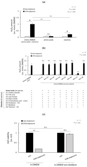 Chemical components of DMEM, such as folic acid and riboflavin, have been reported to produce H2O2 [26]. In order to study which vitamins and/or amino acids are deeply involved in the production of H2O2, we evaluated the production of H2O2 in HBSS containing each of the 14 amino acids and the eight vitamins contained in DMEM exposed to UVA radiation. Table 1 shows the 14 amino acids and eight vitamins contained in DMEM. We compared the amount of H2O2 generated when those components were irradiated with UVA. The amount of H2O2 did not increase significantly when UVA was exposed to a mixed solution of 14 amino acids. Exposure of a solution containing eight vitamins to UVA increased H2O2 production, but at significantly lower levels than a solution mimicking DMEM, which contained 14 amino acids and those same eight vitamins (Figure 2a). In addition, the amount of H2O2 produced in DMEM by UVA exposure was significantly reduced only when riboflavin was removed from the medium. There was no significant change in the amount of H2O2 after UVA exposure in conditions that excluded choline chloride, folic acid, myo-inositol, niacin amide, D-pantothenic acid, 1/2Ca, pyridoxine, HCl and thiamine, and HCl (Figure 2b). The cell viability of fibroblasts cultured in DMEM and exposed to UVA without riboflavin remained high (Figure 2c). The protein level of p16 in fibroblasts exposed to repetitive UVA in riboflavin-free DMEM for 10 days remained at a low level compared to fibroblasts exposed in DMEM (Figure 2d). These data indicate that riboflavin is a master regulator of the production of H2O2 by UVA photosensitization. Lastly, we clarified the components in DMEM that produce H2O2 during UVA exposure by mixing them with riboflavin. Although many components in DMEM were not involved in H2O2 production, folic acid, tryptophan, tyrosine, methionine, and histidine increased the production of H2O2 during UVA exposure in the presence of riboflavin (Figure 3).